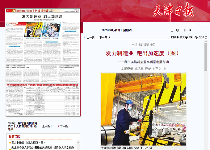 1月19日,《天津日?qǐng)?bào)》十項(xiàng)行動(dòng)調(diào)研行2以“發(fā)力制造業(yè) 跑出加速度”為題,《今晚報(bào)》學(xué)習(xí)貫徹黨的二十大精神見(jiàn)行動(dòng) 看效果專欄以“天津拼出制造業(yè)高質(zhì)量發(fā)展”為題,從公司發(fā)展規(guī)模、綜合實(shí)力等方面報(bào)道了國(guó)家級(jí)制造業(yè)單項(xiàng)冠軍——天津市新宇彩板有限公司良好的發(fā)展態(tài)勢(shì)。