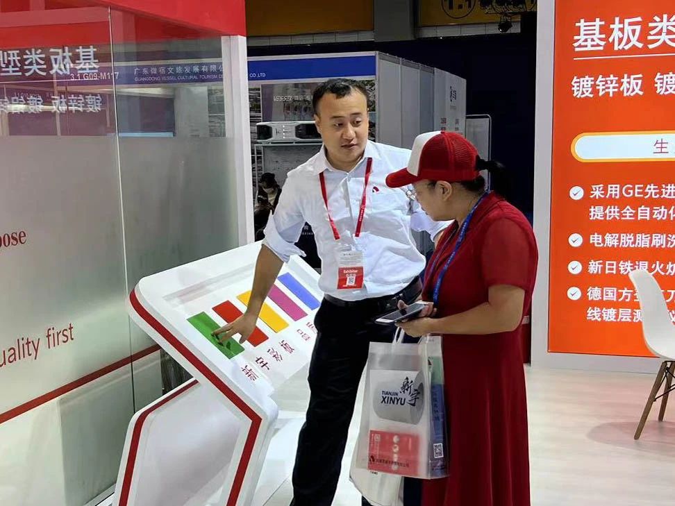 展覽開幕首日,現(xiàn)場(chǎng)人潮涌動(dòng),眾多行業(yè)頭部企業(yè)齊聚一堂。天津市新宇彩板有限公司攜旗下鍍鋅板、鍍鋁鋅板、鍍鋅鋁鎂板等全系涂鍍產(chǎn)品盛裝亮相3.1-R37展位,憑借過硬的產(chǎn)品性能和全面可靠的解決方案,吸引眾多采購(gòu)商咨詢洽談。
